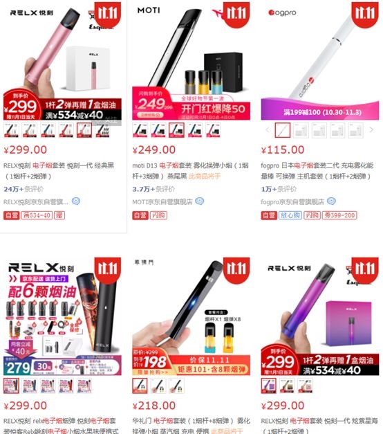 公告发出之后,基金君检索天猫、京东等各大电商平台发现,各式各样的电子烟仍在售卖,价格区间在100至几千元之间不等,300元左右的产品最多。其中多数品牌还参加了各大电商平台的双十一促销活动。