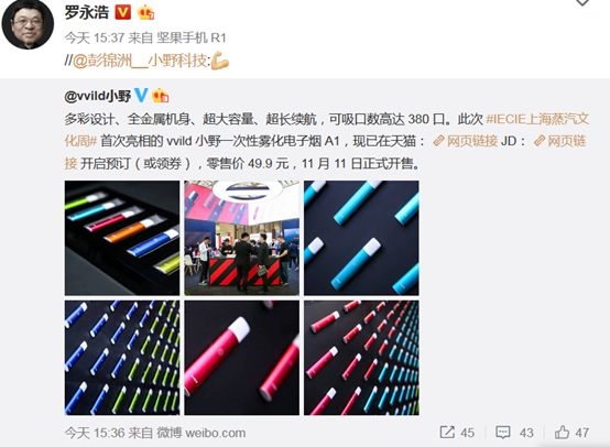 就在昨天下午两部门发文前,罗永浩还转发了一条小野电子烟的宣传微博,宣布小野一次性雾化电子烟A1已在天猫、京东开启预订,将于11月11日正式开售。