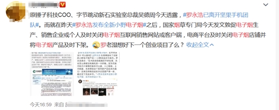 罗永浩则被认为是“最受伤”的人,被调侃“刚就业又下岗”。众所周知,他刚刚放弃手机转向电子烟。罗永浩还曾转发多条微博宣传自家的电子烟品牌。