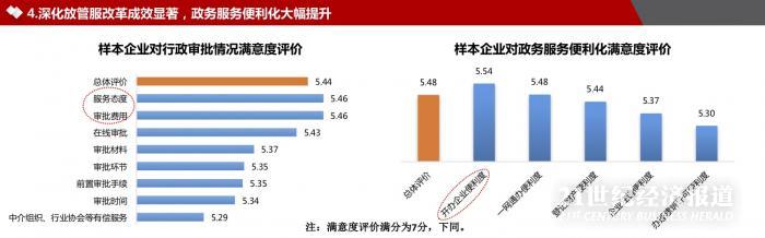 综合情况来看,企业对深化放管服改革成果感受较好,政务环境打分是最高的;企业对法治环境认可度也比较好,认为企业发展法治环境稳定好转;再是要素环境,企业认为要素保障良好,对减税融资惠企政策成效表示肯定;然后是创新环境,整体表现良好,具体内容有待优化;排最后的是市场环境。