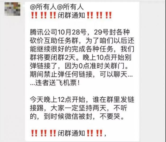 “闭群通知,腾讯将在近日封各种有助力性质的链接群,今晚开始闭群,忍一时风平浪静,退一步海阔天空。”10月27日晚间,多个“点赞互助群”都在发出闭群通知。一时间,有的群改名“休闲养生群”,有的群选择解散,往日24小时滚动信息的助力群也消失匿迹。