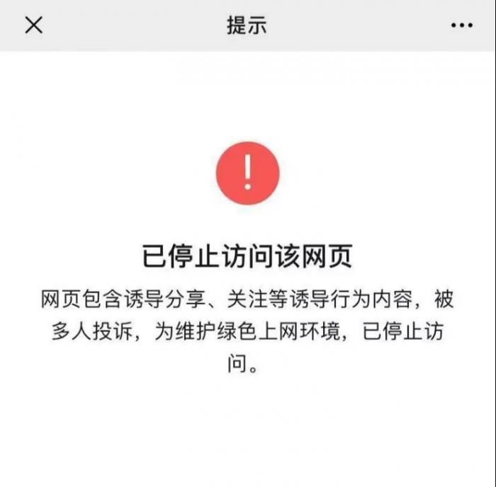近日,微信安全中心发布的《微信外部链接违规内容打击公示》(以下简称“公示”)称,“包含诱导分享类内容的外部链接助长了恶意营销的风气,破坏了原本绿色、健康的微信生态环境,对微信用户造成骚扰,影响用户的使用体验。”