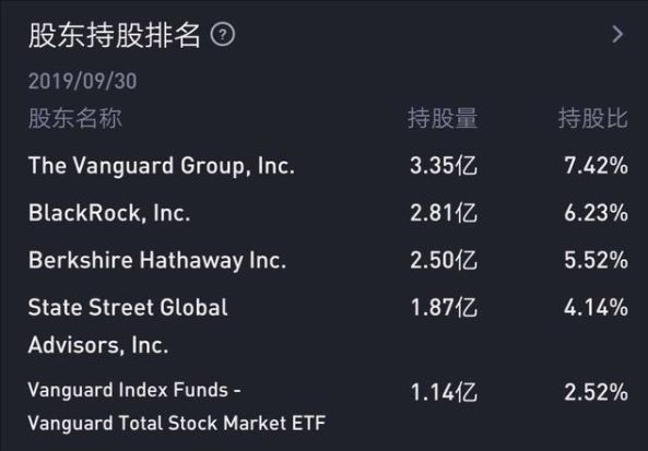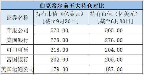 报告显示,截至2019年9月30日,公司的权益性证券投资约66%的总公允价值集中在五家公司:苹果公司570亿美元;美国银行278亿美元;可口可乐218亿美元;富国银行202亿美元;美国运通公司179亿美元。