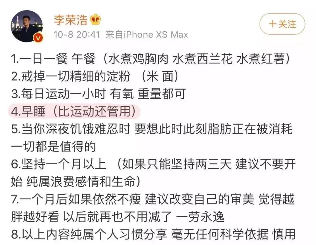 微博发出,立刻登上了热搜,一起被关注的,还有李荣浩晒出的减肥方法。