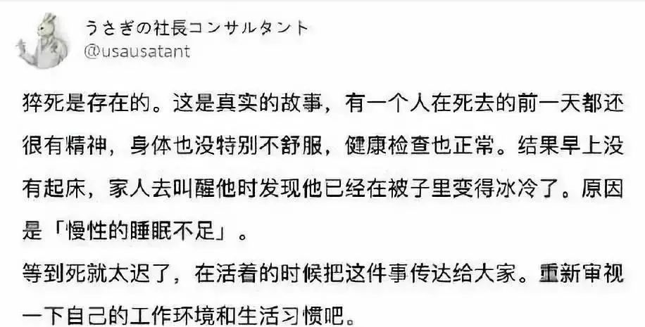 有一个人,前一天都还很有精神,身体也没有不舒服,健康检查也正常。 但是家人早上去叫他起床时,才发现,他已经在被子里变得冰冷了。 而死亡的原因,竟然是“慢性睡眠不足”。