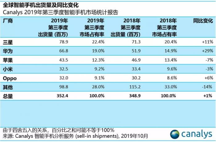 11月1日,多家市场调研公司发布2019年第三季度全球智能手机出货量数据,虽然具体数字略有差异,但前三名排名完全一致。数据显示,三星仍为全球第一手机品牌,华为其次、苹果第三。其中,华为Q3手机出货量达6680万台,增长率达29%,市场份额进一步逼近三星。