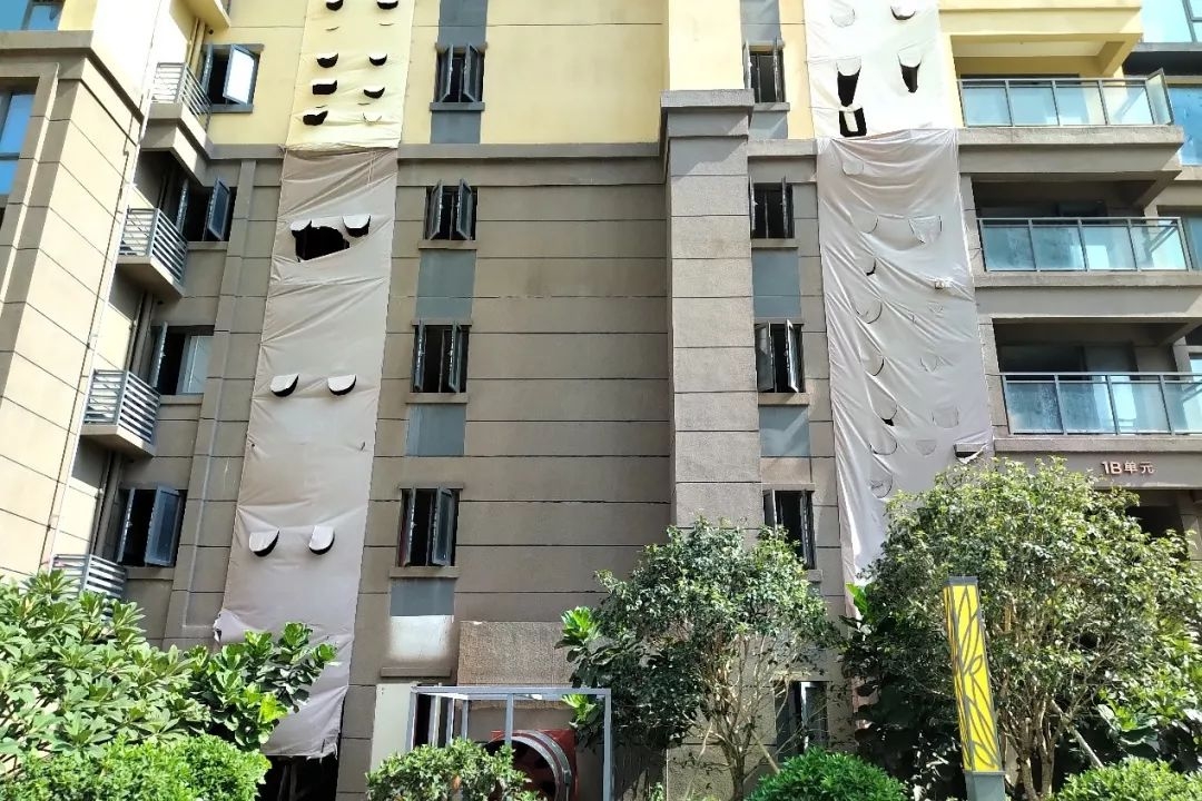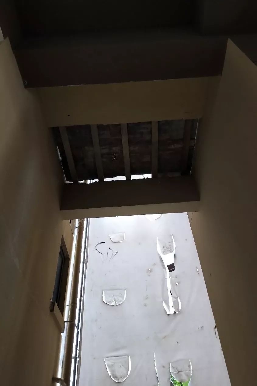 记者日前来到位于深圳市龙岗区平湖街道的卓越星源项目(合同备案名“中环阳光星苑”)。记者在该小区看到,多栋楼的楼面部分都被从楼顶展开的一张巨大塑料布所遮盖,走近可以发现,塑料布遮盖的是采光天井,原本存在的楼板被全部一层层凿穿,从下往上望去只剩一个个黑洞。