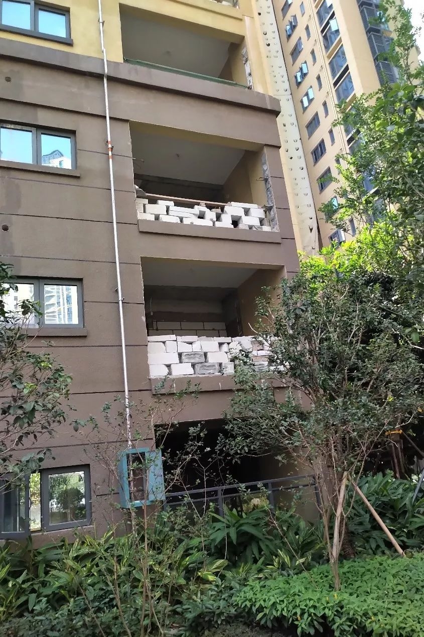 此外,在另外一些楼栋的阳台处,也可以看到明显的外立墙面被拆除痕迹。