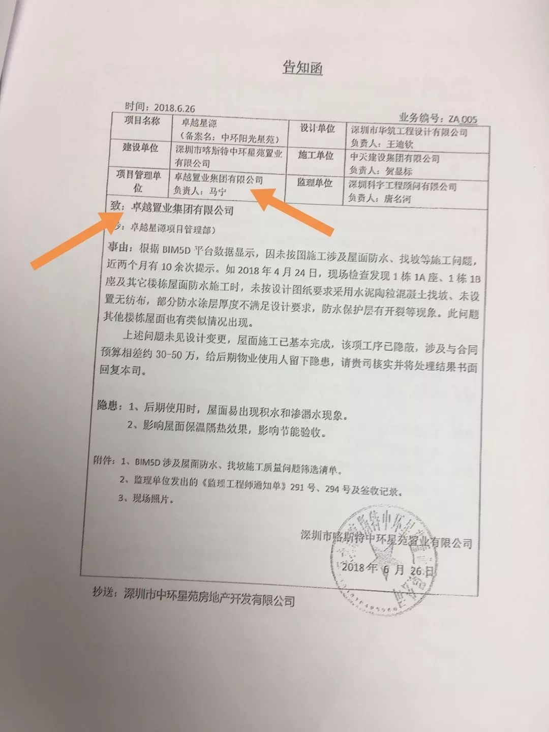 卓越星源另一个被业主诟病的是质量问题。另一位业主吴鹏说,根据购房合同的约定,今年6月30日该楼盘应该正式向业主交房。但在这一天,负责管理该楼盘物业的深圳市智慧空间物业管理服务有限公司却向业主公示了一份《关于“中环阳光星苑”项目目前因工程质量问题检验未通过的情况说明》,除了告知业主楼盘因质量问题无法按时交楼外,还列出包括“两次柱头压爆裂重大结构问题未经设计方确认和专家认证;地下室顶板和消防水箱等部位打孔注浆堵漏破坏结构及消防线路问题;多部电梯基坑及井道漏水问题未彻底解决”等14项问题清单。对于需要整改的责任方,《说明》直指项目的代建方卓越置业集团有限公司和施工单位中天建设集团有限公司。