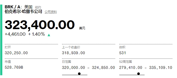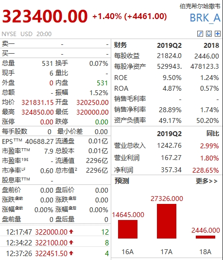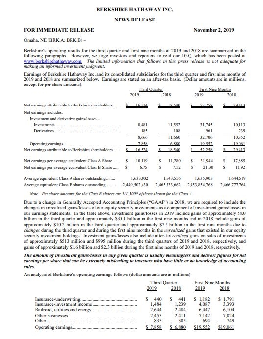 伯克希尔第三季度A类股每股收益为10119美元,B类股每股收益为6.75美元。前九个月A类股每股收益为31944美元,去年同期为17885美元;前九个月B类股每股收益为21.30美元,去年同期为11.92美元。