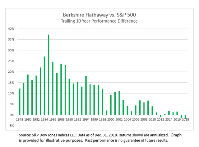 从上图回顾伯克希尔的股价与同期标普500指数之家的涨幅差距来看,自1978年到2002年期间,伯克希尔以每年超过10%以上的幅度超过标准普尔500指数。但是这种超额表现,在2002年之后划上了句号,特别是自从2009年之后,已经有三次低于标普500指数,而2019年更将是伯克希尔股价表现大幅低于标普500指数表现的历史性一年,创下10年来最差业绩,更是伯克希尔历史上罕见最低业绩。