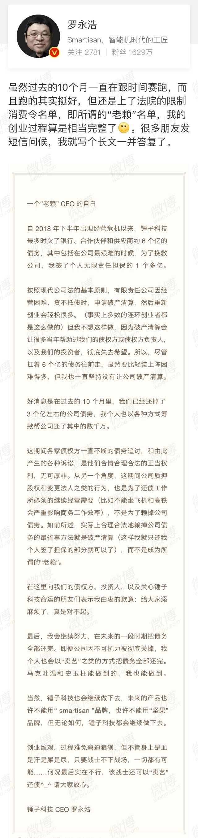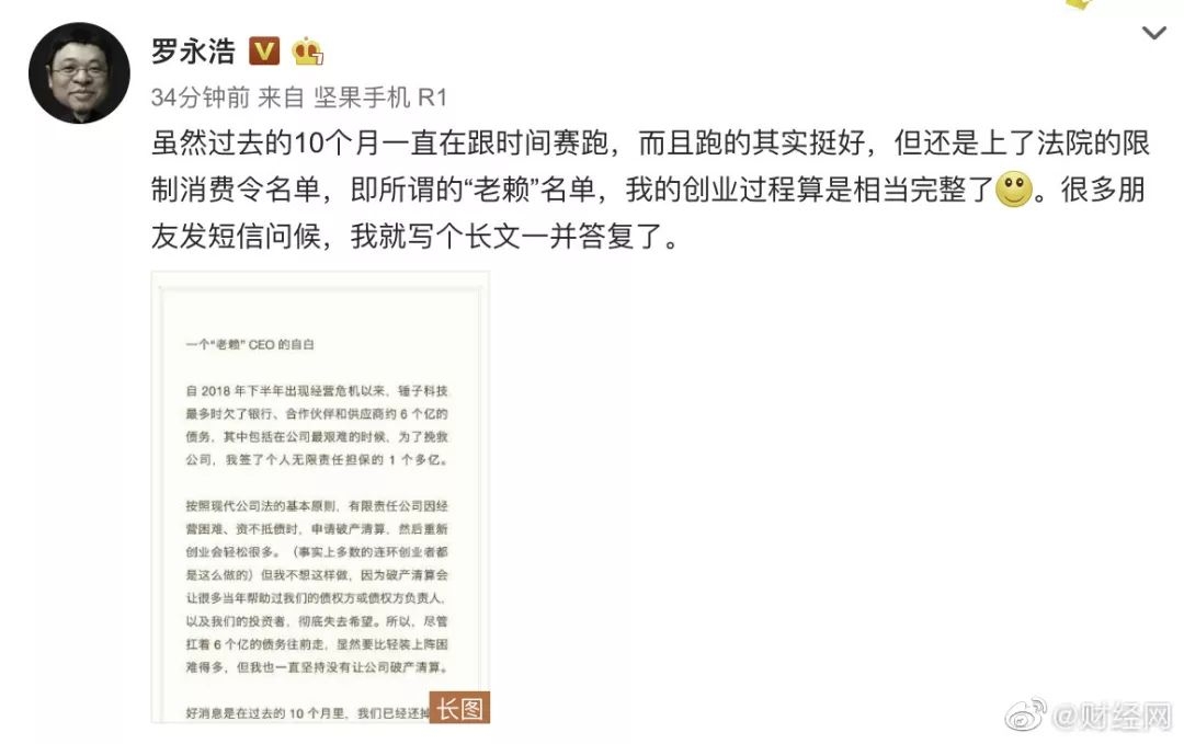 刷屏!罗永浩成“老赖”,长文微博悲情回应:哪怕卖艺也会还钱!最惨时欠债6亿