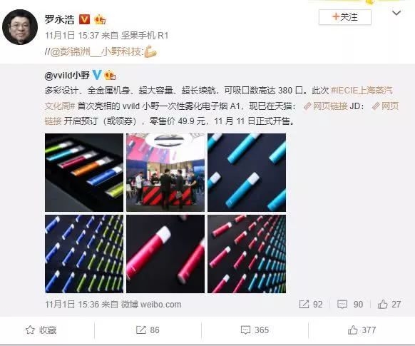 11月1日15时37分,罗永浩转发了小野电子烟即将发售新品的消息。