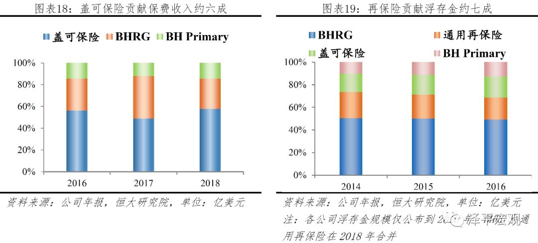 从各保险公司保费收入看,盖可保险是保费收入的主要贡献者,2018年盖可、BHRG和BH Primary保险收入占比分别为58%、28%、14%;而再保险是浮存金的主要贡献者,各公司浮存金数据仅公布到2016年,BHRG、通用再保险(2018年并入BHRG)、盖可、BH Primary浮存金占比分别为49%、19%、19%、13%。按照这一比例估算,再保险业务为伯克希尔贡献的浮存金占68%。