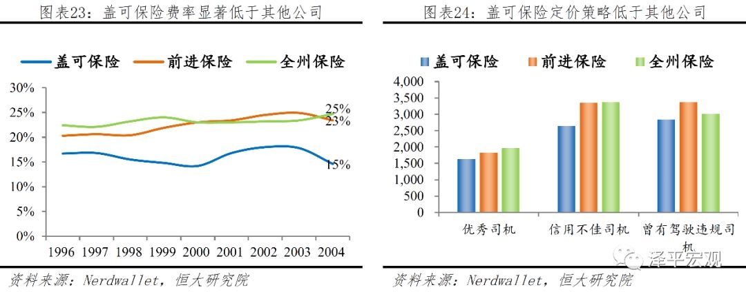 三是以直销模式控成本。伯克希尔旗下盖可保险是美国最大的汽车保险公司之一,竞争优势在于极致成本控制,盖可保险常年综合成本率维持在96%以下,资金成本为负。1)聚焦低风险优质客户。盖可保险最初客户为政府雇员,行为偏好较为保守,驾驶汽车出险概率较低。2)打造强大的直销渠道。盖可保险为直销型保险公司,顾客主要通过电话、互联网和邮寄的方式购买保险,2010年它成为全球首家支持手机投保的保险公司,省去了传统保险的庞大代理人队伍和费用,因而成本和定价更低。3)凭借低价和口碑,提高市占率。盖可保险根据投保人的驾驶背景、教育程度、忠诚度等给予折扣,甚至可以分期付款,同时打出“15分钟节省15%”的广告语,高效与优惠口碑甚佳。盖可保险业绩持续增长,市占率由2000年的4.7%增长至2018年的13%。
