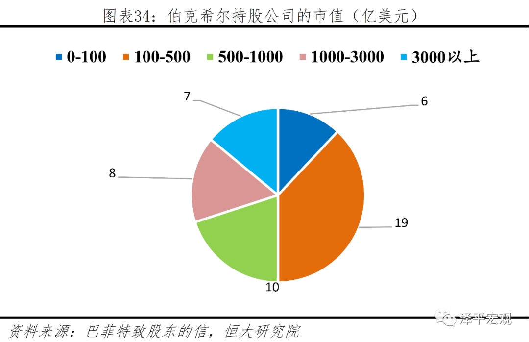 规模上偏好大型企业。1)总资产偏好500亿以上企业。有4家公司总资产超过1万亿美元,29家在500亿-10000亿美元之间,合计占比66%。总资产规模最大的5家公司是摩根大通、美国银行、富国银行、高盛、美国合众银行,均为金融类企业,共持仓637亿美元,占其仓位高达30%。2)营业收入偏好在100亿以上企业。有8家公司总营收超过1000亿美元,31家在100亿-1000亿美元之间,合计占比78%;总营收最高的5家公司是苹果、亚马逊、通用汽车、好市多、菲利普66,以消费、科技类企业为主,伯克希尔共持仓549亿美元,占其仓位的26%。3)市值超千亿美元15家。伯克希尔持有公司的市值在3000亿美元以上7家,1000-3000亿美元的8家。总市值最高的5家公司是苹果、亚马逊、摩根大通、强生、维萨,伯克希尔共持仓594美元,占其仓位的28%。4)旗下多达11家世界500强。伯克希尔旗下子公司11家能够进入世界财富500强,包括精密机件公司、卡夫亨氏、伯灵顿北方圣达菲铁路、伯克希尔·哈撒韦能源公司、IMC(以色列金属加工工具供应商)、路博润以及Marmon等。