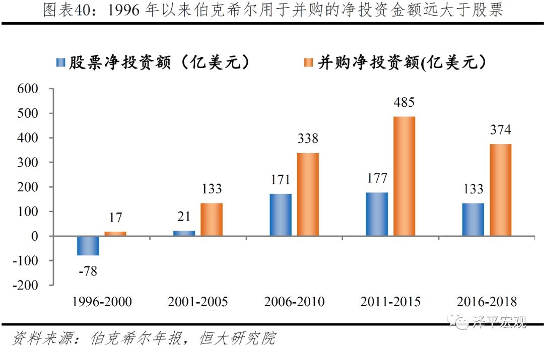 巴菲特一旦看好投资标的,投资方式通常采用二级市场投资和收并购两种方式。从资金流向看,近20年伯克希尔更加侧重收并购,1996-2018年,其用于收并购的净现金支出合计约1350亿美元,为同期股票相应金额的3倍;从结果看,伯克希尔对非上市子公司的依赖性逐年增加,资产结构从“以股票为主”变为“实业和股票并重”。