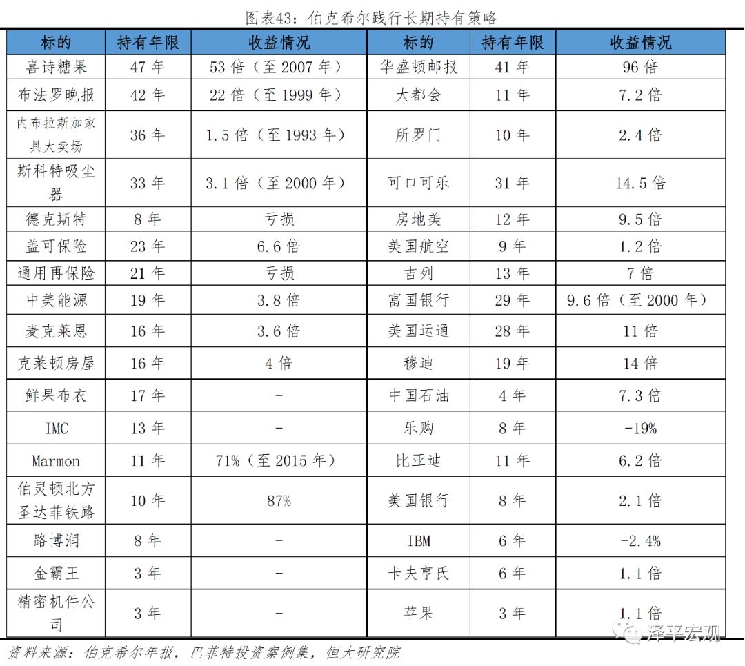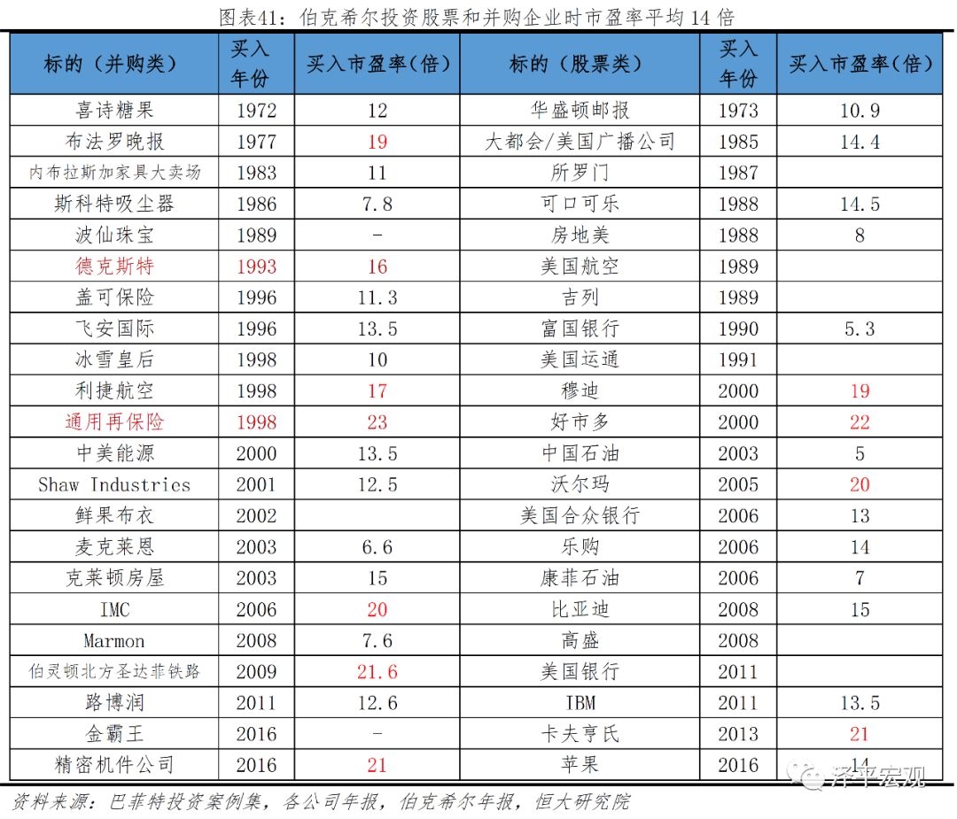 巴菲特在1998年曾说:“对我们来说,最好的事情就是一家伟大的公司陷入暂时的困境。我们想在他们躺在手术台上时买入”。善于结合两种方法寻找低估股票:一是绝对估值法。巴菲特自有一套计算内在价值的方法,即一家企业在其余下的寿命中可以产生的现金的折现值。1988年巴菲特首次购入可口可乐股票,股价被认为是处于历史高位,相当于花了5倍于账面价值的钱收购13亿美元。但巴菲特坚信可口可乐内在价值被低估, 经过30年可口可乐市值已经从150亿上升到2000亿美元。二是相对估值法。我们梳理出44家巴菲特经常提及的投资标的,买入时平均市盈率为14倍,68%股票市盈率小于15倍。