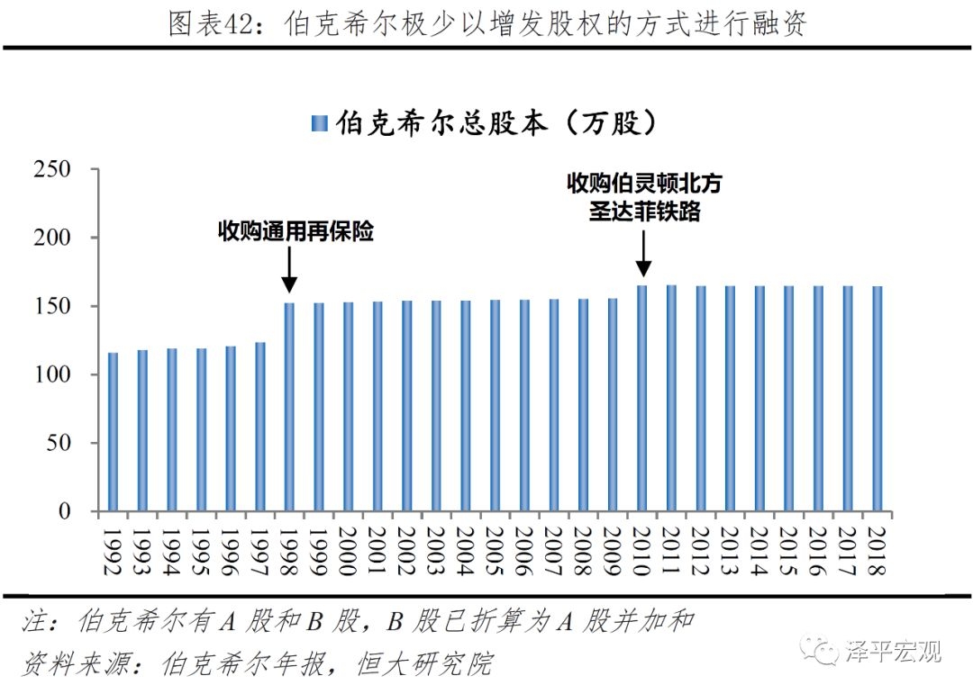二是支付工具上,现金>增发股权,避免股权稀释。伯克希尔股票长期增值潜力巨大,过去20年增值5倍,因此增发股权比现金购买的机会成本更大,历史上伯克希尔主要以现金的方式进行并购,增发股权的次数及规模较少。1988年巴菲特在收购通用再保险时发行了27万股伯克希尔股票,使流通股股份增长了21.8%,他承认为这是一件糟糕的投资,为这家公司支付了过高收购价格。