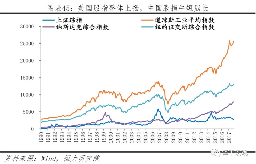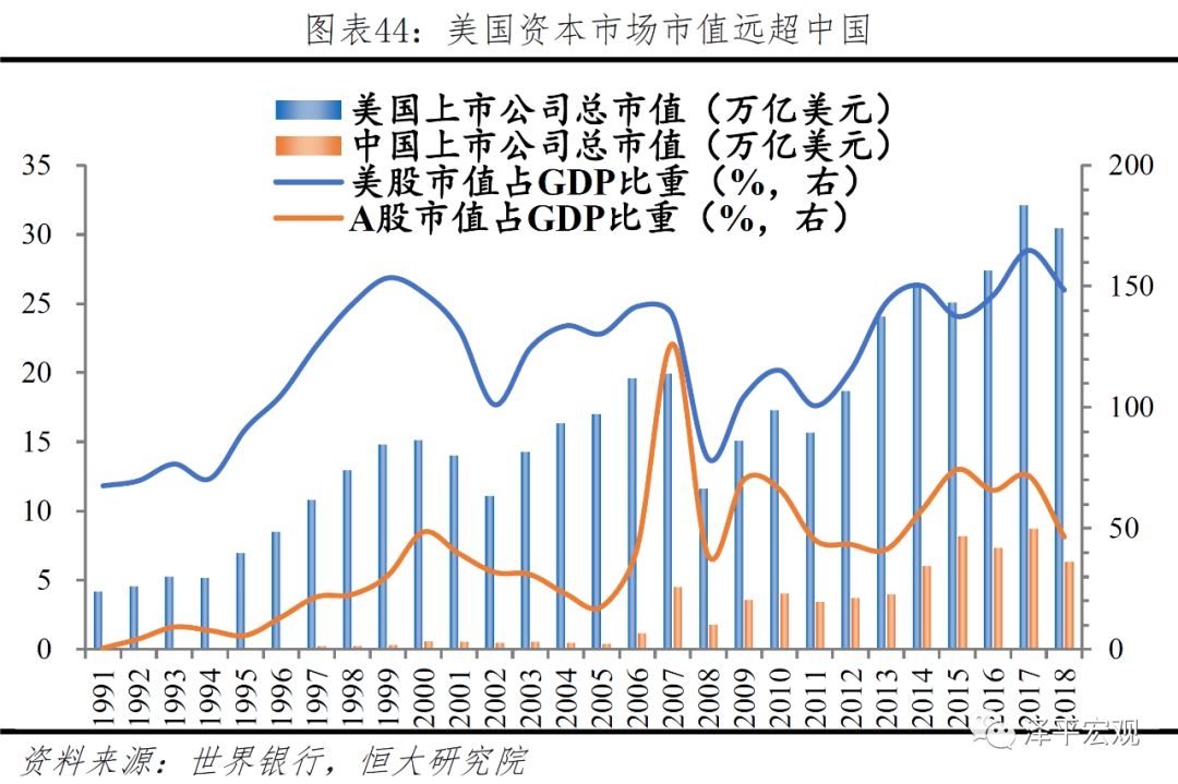 中国经济体量为美国65%,但资本市场体量仅为美国21%,市场环境有待改善。中国改革开放以来,经济发展取得举世瞩目成就,2018年美国GDP达到20.5万亿美元,增速2.9%,中国GDP总量13.6万亿美元,增长6.8%。中国经济体量达到美国65%,位居世界第二大经济体。但中国资本市场体量还远远不足以匹配经济体量。2018年美国上市公司总市值30万亿,占GDP比重149%,中国上市公司总市值6.3万亿,占GDP比重46%,中国资本市场体量仅为美国五分之一。中国资本市场环境待改善。发达的资本市场能够形成价值投资良性生态,优质公司得到应有的估值,价值投资者得到应有的回报,形成健康长牛发展格局。但我国资本市场在法律法规、监管方式、市场生态上还存在很多不足,市场波动大,投机氛围重,各类金融乱象丛生,价值投资良好生态仍然任重道远。