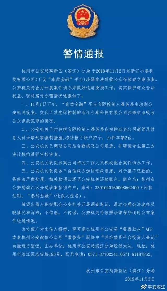 11月2日,杭州市公安局高新区(滨江)分局发布通报对浙江小泰科技有限公司(下设“泰然金融”平台)涉嫌非法吸收公众存款案立案侦查。