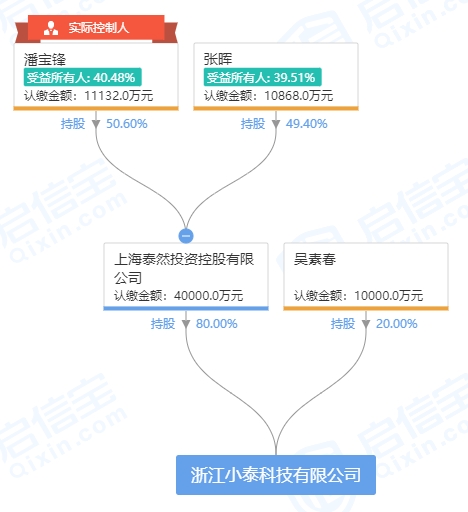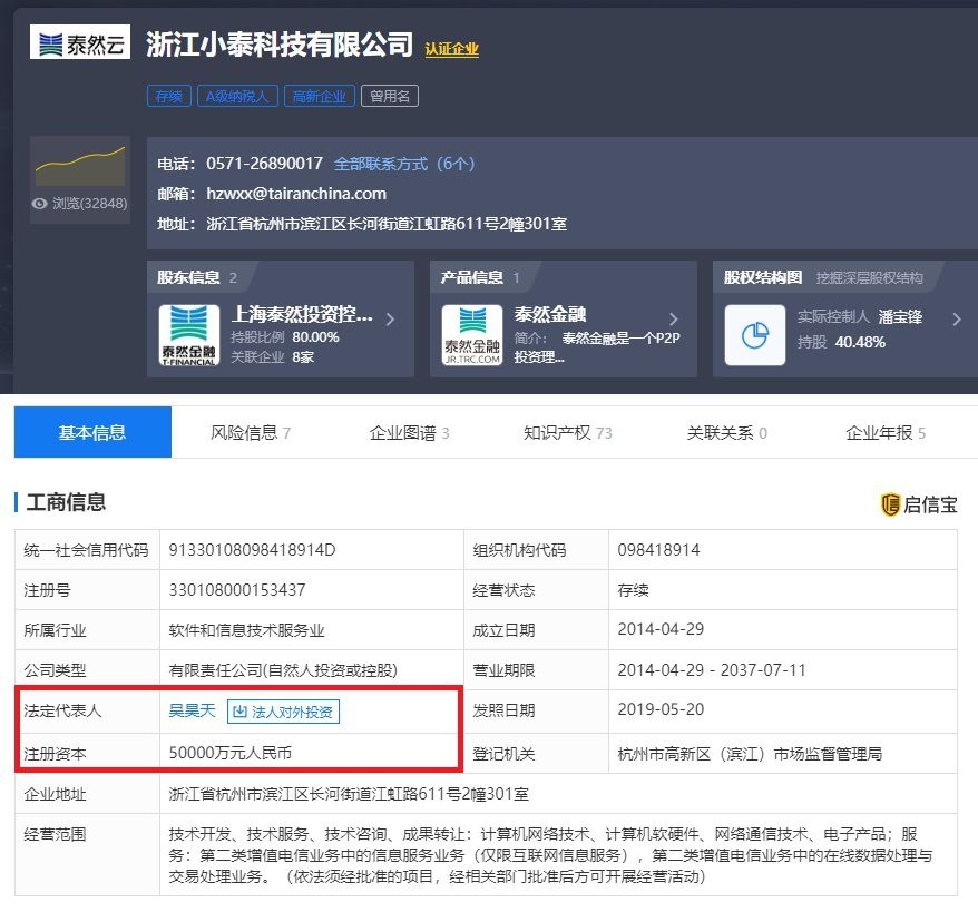 据启信宝显示,泰然金融运营主体为浙江小泰科技有限公司(曾用名:浙江泰玄网络科技有限公司),成立于2014年4月29日,法定代表人为吴昊天,注册资本达5个亿。