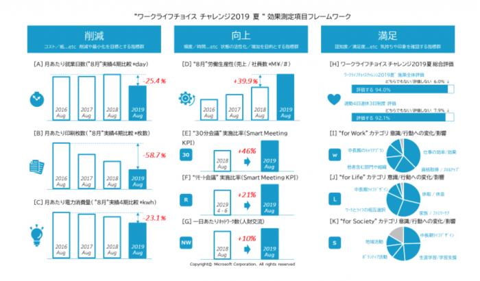 这一切可能听起来美好得有点不真实。不过,微软日本称通过用公司开发的工作效率可视化系统Workplace Analytics统计发现,在试行“做四休三”推行期间,员工的工作效率较去年同期提高了40%,不仅如此,公司的开支、成本也得到了显著的降低。具体的量化结果为,8月份的劳动生产力(销售额比员工数)同比提高了39.9%,30分钟会议的数量提高了46%。与此同时,工作时间同比下降了25.4%,打印文件量下降了58.7%,用电量下降23.1%。