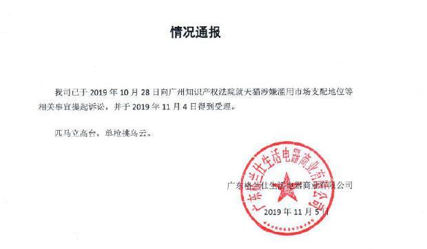 “匹马立高台,单枪挑乌云!”11月5日,格兰仕在官微用这样一句诗句宣布:已于2019年10月28日向广州知识产权法院就天猫涉嫌滥用市场支配地位等相关事宜提起诉讼,并于2019年11月4日得到受理。