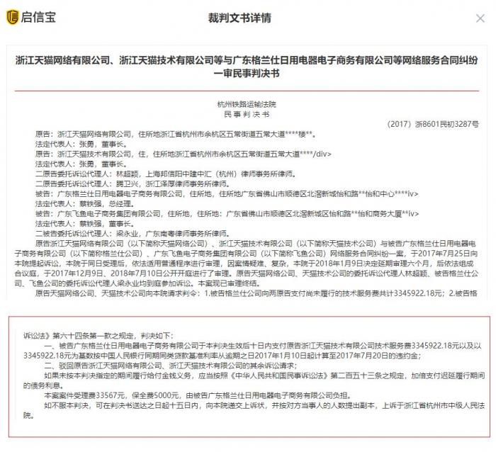 在2018年7月23日发布的天猫状告格兰仕网络服务纠纷案件中,法院判决广东格兰仕集团有限公司支付原告浙江天猫技术有限公司技术服务费334.59万元以及违约金。而在另外一个侵权案件中,格兰仕的上诉理由因缺乏法律依据,未被法院支持。