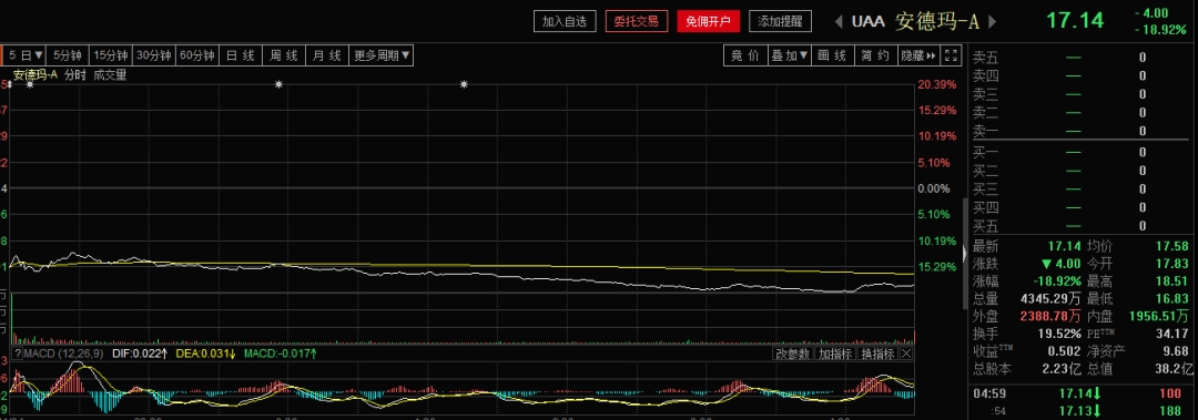 受此影响,安德玛在美股开盘前就一度杀跌超过11%。开盘之后,其股价继续上演单边杀跌,截至收盘,安德玛暴跌18.92%。