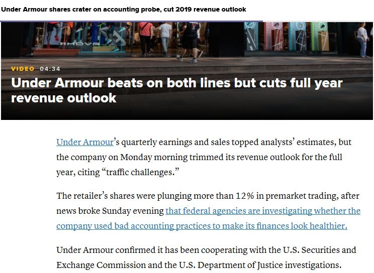 安德玛近期利空消息不断,公司最近意外宣布领导层人事变更之后,又披露正遭遇美国司法部和证监会的调查,因涉嫌会计操纵,夸大收入。据彭博社报道,目前美国司法部和证券交易委员会已经介入调查安德玛的财报会计做法,调查的重点在于安德玛是否夸大了季度销售额。