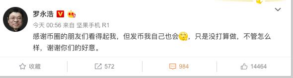 虽然创业维艰,但罗永浩迅速谢绝了币圈的卖艺邀请。