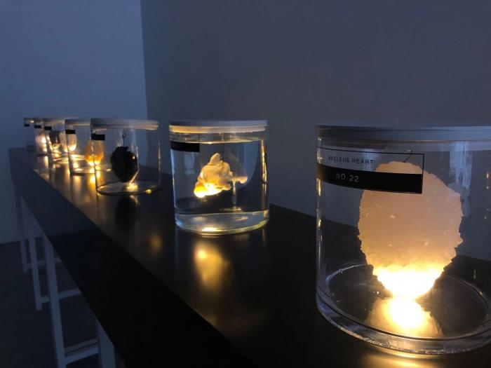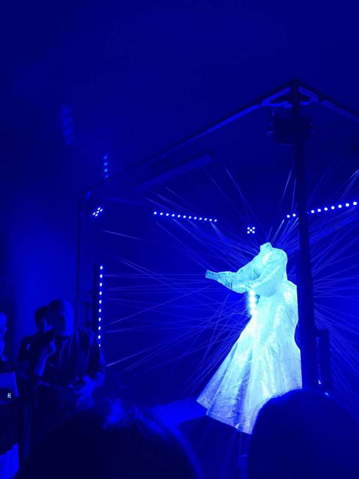 记者在展览现场看到,在一个大约10平方米的黑乎乎的房间里,拥簇着许多观众。在房间正中央,一件发出蓝色光芒的女装长裙被许多丝线悬空挂起。据艺术家大崎洋美的现场讲解,这件荧光蚕丝织成的梦幻连衣裙,使用了来自添加了发光水母和珊瑚基因的改造蚕所吐得丝,织就而成。因此在现场阴暗的情况下,依然能发出梦幻般慑目的蓝色光芒。通过融合了生物学上的科技理论,她希望可以向大家发出邀请,让观众思考艺术、科学和技术三者交互过程中的极限与局限。