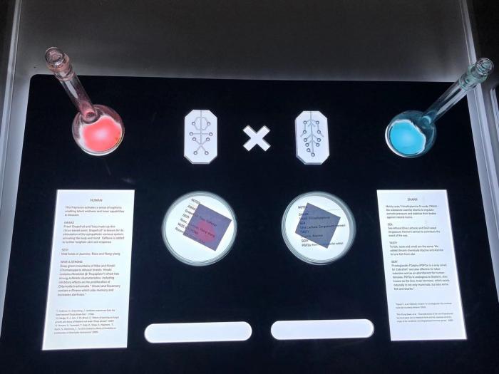 而在展厅的另一边,记者看到一个特殊的展柜旁边也围绕了许多好奇的观众。展柜里放着红色和蓝色的实验瓶,在实验瓶旁边,还展示有两张基因图谱,下面附有一小段文字解释香水前中后调的味道。这是日本艺术家长谷川爱的作品《人类x鲨鱼》,实物部分由两瓶香水组成,一瓶名为“人类”,一瓶名为“鲨鱼”。“人类”的香味融合了野生茉莉花的气味,还有以刺激交感神经系统而著称的葡萄柚香精,艺术家认为这是一种可以同时激活愉悦感、野性和内在能力的香气。“鲨鱼”中主要使用了氧化三甲胺(TMAO),让香水在视觉上可以表现鲨鱼金属质感的皮肤,以及让人们想起海水味的海藻提取物。日本艺术家长谷川爱脑洞大开地探索人与动物如何通过气味交流。艺术家想到,在未来,生物技术也可能使人类具有同性繁殖或者孤雌生殖的繁衍方式。在艺术家看来,鲨鱼象征了“充分利用黑科技的、健壮而野性的女性”。作品中体现了对女性身份的探讨,艺术家希望以此充分表达她不受任何传统“女性”思想束缚的态度。借助艺术和设计,她为大多数日本女性在日本社会中所遭受的压抑提供了一种狂野的诗意想象。