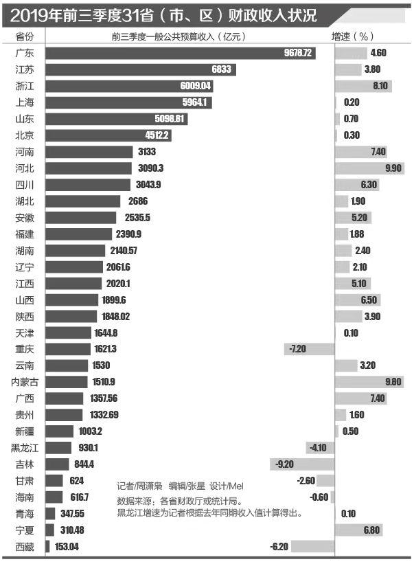 受减税降费、经济形势等影响,前三季度仍有6省份财政收入延续负增长态势,分别是吉林、重庆、黑龙江、海南、甘肃、西藏。