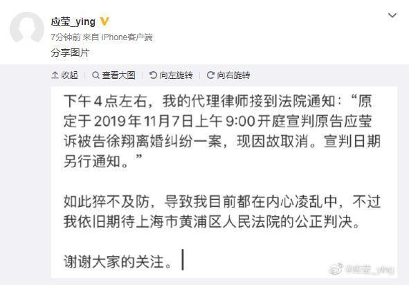11月6日,徐翔妻子应莹在社交媒体表示,下午4点左右,代理律师接到法院通知:“原定于2019年11月7日上午9:00开庭宣判原告应莹诉被告徐翔离婚纠纷一案,现因故取消。宣判时间另行通知。”