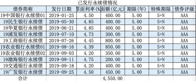 今年1月25日,中国银行成功发行首单银行永续债。截至目前共有9家银行发型了10单共计4550亿元永续债,利率在4.2%-4.9%之间。