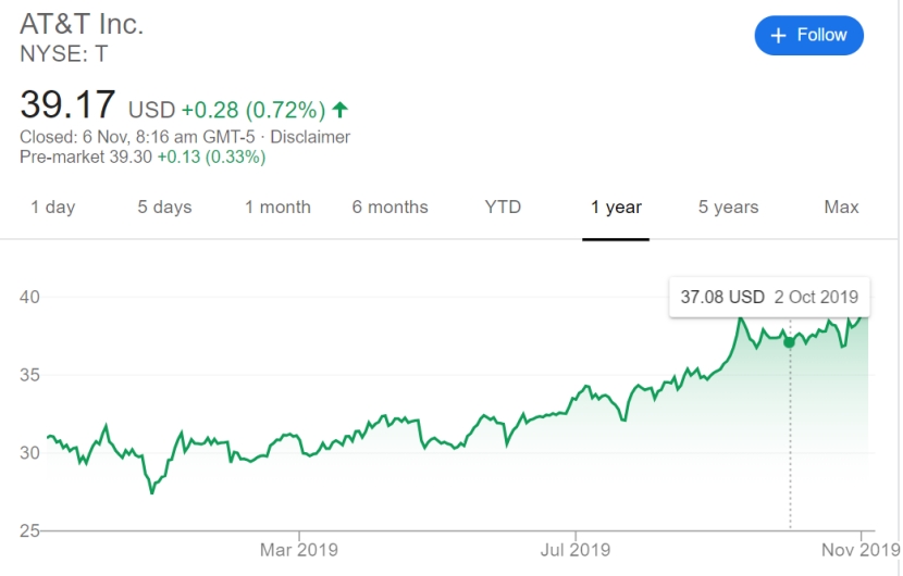 11月6日盘前,AT&T股价达到39.3美元,接近一年来的高点,市值约为2860亿美元。