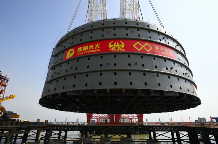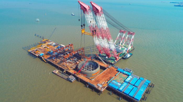 图为:深中通道伶仃洋大桥西索塔1800吨钢吊箱下放 图片来自广东省交通集团