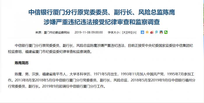 11月8日,厦门市纪委监委在其网站发布消息称,中信银行厦门分行原党委委员、副行长、风险总监陈鹰涉嫌严重违纪违法,目前正接受中央纪委国家监委驻中信集团纪检监察组、福建省厦门市纪委监委纪律审查和监察调查。