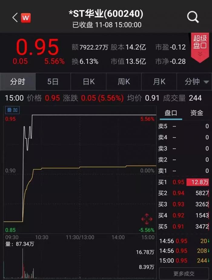 11月8日,*ST华业早盘上演“地天板”,股价报0.95元/股。这意味着,如果未来两个交易日股价在现在基础上涨逾5分钱,升破1元线,*ST华业就暂时熬过退市“关口”,面值退市的20个交易日周期将重新计算。