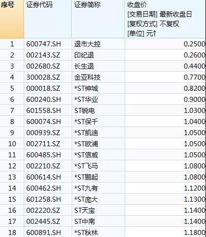 Wind数据显示,除了上述6只面值退市股票,以及*ST保千、*ST凯迪等已经被交易所暂停上市的公司外,目前仍有6家上市股票价格低于1.1元/股,10家上市公司股票价格低于1.2元/股。除创业板公司外,这些公司无一例外都被交易所实施了退市风险警示或其他风险警示。