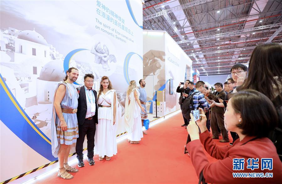 11月8日,在第二届进博会希腊国家馆,参观者与身着希腊传统服装的工作人员合影。 正在举行的第二届中国国际进口博览会上,展馆上下、展台内外、展品周围,都留下了观众们拍照“打卡”的身影。 新华社记者 方喆 摄