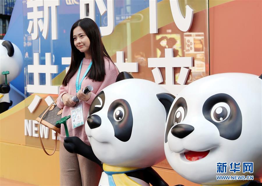 11月8日,观众与进博会吉祥物“进宝”合影。 正在举行的第二届中国国际进口博览会上,展馆上下、展台内外、展品周围,都留下了观众们拍照“打卡”的身影。 新华社记者 刘颖 摄