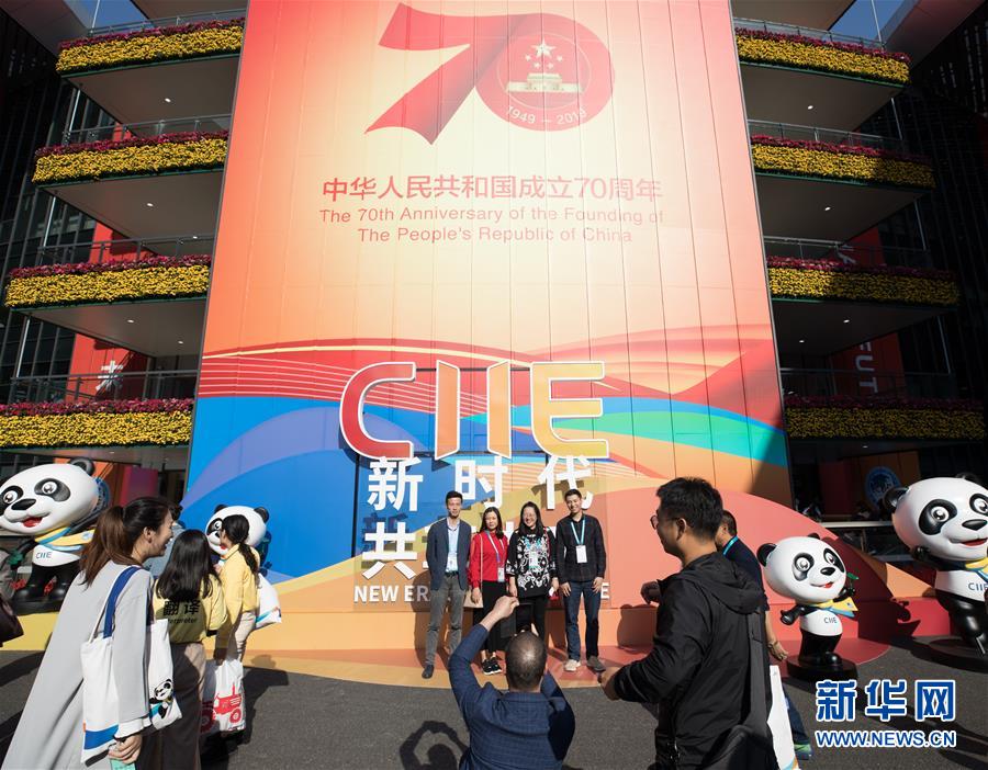 11月8日,参观者在上海国家会展中心合影留念。 正在举行的第二届中国国际进口博览会上,展馆上下、展台内外、展品周围,都留下了观众们拍照“打卡”的身影。 新华社记者 金立旺 摄