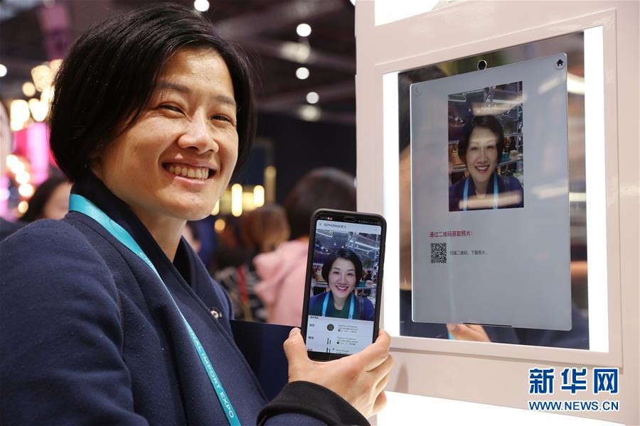 11月8日,在第二届进博会品质生活展区,一名观众在某美妆品牌展区通过“虚拟化妆镜”获得定妆照。 正在举行的第二届中国国际进口博览会上,展馆上下、展台内外、展品周围,都留下了观众们拍照“打卡”的身影。 新华社记者 刘颖 摄