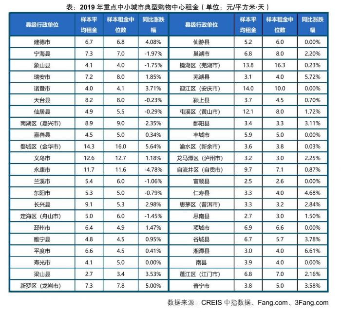数据显示,2019年中国重点中小城市购物中心租金水平整体稳中趋涨,样本平均租金为6.5元/平方米·天,同比上涨1.52%。