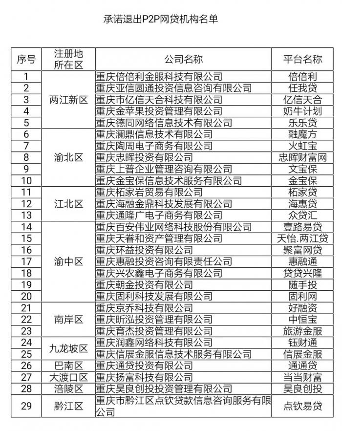 公告显示,现根据工作安排,将我市29家已报告结清P2P网贷业务、拟主动退出的机构(名单见附件)进行公示,公示期为十五日,拟退出机构在正常公示结束后,根据退出承诺办理注销登记或进行名称、经营范围变更,退出P2P网贷行业。同时,对我市其他机构开展的P2P网贷业务一并予以取缔,任何机构未经许可不得开展P2P网贷业务。
