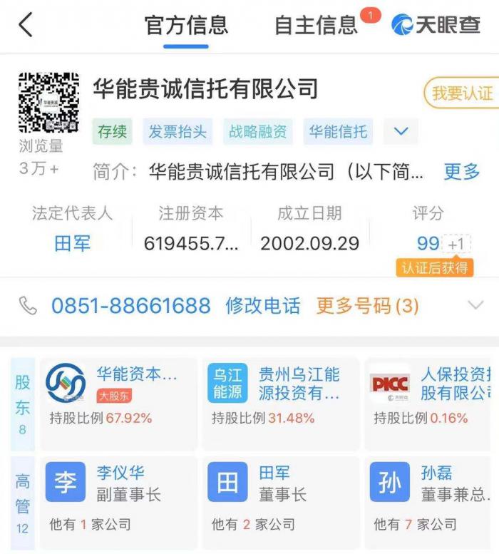 工商信息显示,华能信托为华能集团与贵州乌江能源集团合资公司,前者通过华能资本持有该公司67.92%的股份,后者则通过贵州乌江能源投资有限公司持有31.48%的股份。