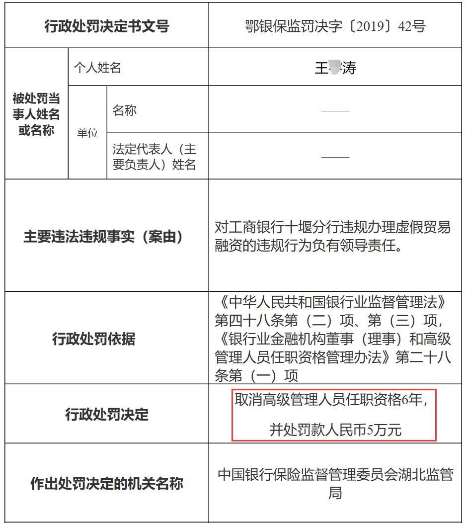 值得注意的是,工行十堰分行及其四家支行的高管因违规办理虚假贸易融资被取消高级管理人员任职资格。据《银监法》第四十八条第(二)项、第(三)项,《银行业金融机构董事(理事)和高级管理人员任职资格管理办法》第二十八条第(一)项相关规定,王某涛因对工商银行十堰分行违规办理虚假贸易融资的违规行为负有领导责任,被取消高级管理人员任职资格6年,并被罚款5万元。